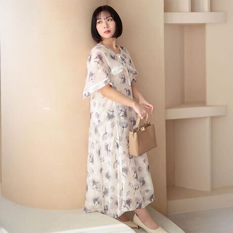 ケープをかけたような袖デザインがポイントのフラワーワンピース。ふわっと広がるケープ風のデザインでトレンド感を演出し、気になる二の腕をカバーしてくれます。水彩画のような淡い色合いの花柄が上品で大人っぽい印象に。ウエストの切り替え位置が高めで、スタイルアップしてくれます。後ろはゴムシャーリング&リボンで調節可能のデザインでストレスフリーな着心地です。透け感が涼しげな印象に。普段使いはもちろん特別なお出かけ着としてもおすすめの一着です。