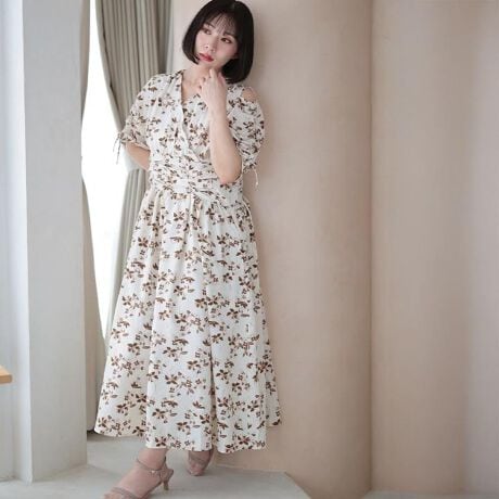 落ち着きのある花柄プリントがエレガントなフレアシルエットのワンピース。胸元はカシュクールデザインで、肩スリットが女性らしさを引き立てます。ウエストはタック、後ろはシャーリングでくびれをメイク。フレッシュなXラインが完成する、着映え力のある一枚です。凹凸感のあるさらっとした生地で、爽やかなシルエットも魅力。デートやお呼ばれなど、特別な日に着ていくワンピースとしておすすめです。