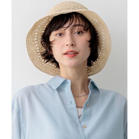 ■デザイン・素材ペーパー素材を丁寧に手編みで仕上げた清涼感のあるバケットハットです。編み地の間に透かし模様を入れることで見た目にも涼しく軽やかな印象を与えます。手編みならではの柔らかさとナチュラルな風合いが大人のカジュアルスタイルに程よい抜け感をプラス。つばの長さも程よく日除け対策としてはもちろんコーディネートのアクセントとしても重宝します。tシャツやデニムと合わせたラフなスタイルから、フェミニンなワンピースの外しアイテムまで幅広く活躍。折りたたんで持ち運びもしやすいため旅行やリゾートシーンにも最適です。カラーは素材の風合いが際立つナチュラルなベージュ(#033)の1色展開です。