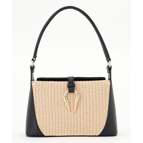 ■デザイン・フェイクラフィア×フェイクレザーのコンビ素材・夏らしさがありつつ、カジュアルになりすぎないきれいめデザイン・口開きが良く、物の出し入れがしやすい仕様・中身が見えにくく、安心感のある設計・正面のモチーフ金具がアクセントに
