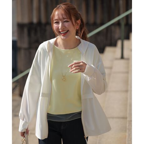 ・スポーティさを抑え、タウンユースにも着やすいラッシュガード・後ろ身頃のヨーク下には風通しの良いメッシュ素材を使用し、ムレにくく快適・右ポケットは貴重品も安心のファスナー付き・切り替えでウエスト位置を高く見せ、スタイルアップ効果・ウエストのギャザーが腰回りをふんわりカバー・袖丈は長めでサムホール付き、手の甲までしっかりガード・ゴールドファスナーがきれいめなアクセント・日差しを防ぐ大きめフード付き