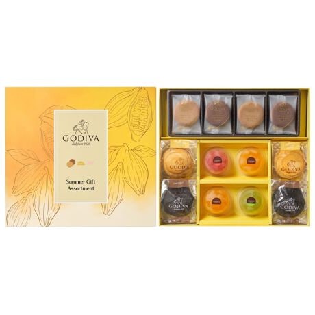 [型番:4531714194311]ゴディバで人気の「カカオフルーツ ジュレ〜カカオの果肉をフルーツとして楽しむジュレ〜」「ラングドシャクッキー」「ドームバームクーヘン」の3種を色とりどりにアソートしました。夏の爽やかさをグラデーションで表現した限定パッケージに詰め合わせました。<包装形態>掲載画像が最終形態(包装対応無し)となります。<賞味期限>1ヶ月以上ある商品をお届けいたします。