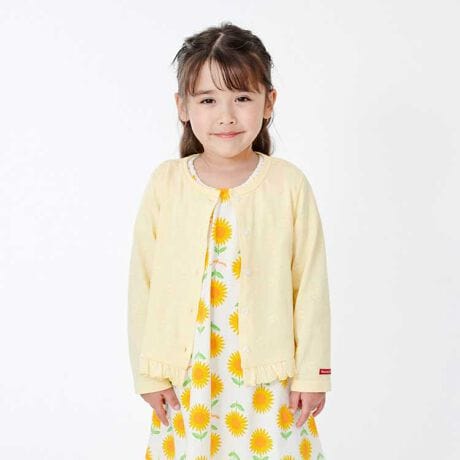 汗を吸い取り、すばやく乾燥する吸水速乾。吸湿&吸熱のW効果で涼感を与える接触冷感加工。更にUVカットで日焼け対策や冷房対策など、夏のお出かけにオススメ!花柄部分が少し立体になった花柄ジャガード素材のカーディガン。裾フリルが女の子らしい!シンプルでどんなアイテムとも合わせやすい!【アイテム】トップス シンプル ガーリー フェミニン カジュアル お洒落 オシャレ かわいい 可愛い 普段着 デイリーウェア お出かけ着 お外着 お外遊び着 子ども こども 女児 女の子 ガールズ キッズ ベビーサイズ トドラーサイズ 幼稚園 保育園 小学校 通園 通学 小学生 2026年春夏物新作 丸高衣料 ロングスリーブ 長袖 ホワイト 白色 クリーム イエロー 黄色 ムージョンジョン フラワー