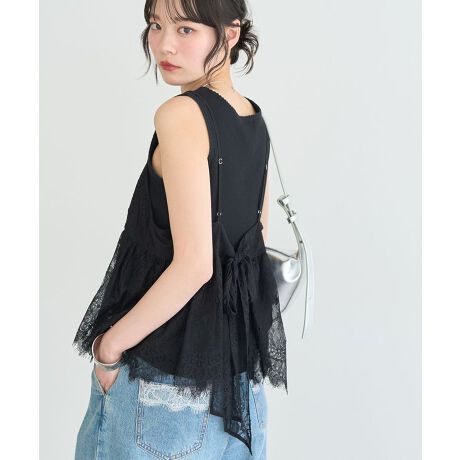 揺れるレースで魅せる大人のフェミニンスタイル動くたびにふわりと揺れるレースが、やさしく華やかな印象を演出してくれる一枚です。フリンジディテールがさりげないアクセントになり、シンプルなインナーに重ねるだけでこなれ感のある着こなしが完成します。バックリボンデザインが後ろ姿に可愛らしさを添え、360度どこから見ても抜かりないスタイルに仕上がります。肩ひもはアジャスター付きで調整しやすく、体型やスタイリングに合わせてバランスよく着用できます。カジュアルなデニムからスカートまで幅広く合わせやすく、季節の変わり目にも活躍するレイヤードアイテムです。透け感[あり]