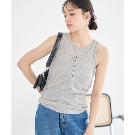 重ねるだけでこなれる大人可愛いレイヤードタンクシアー素材とフライス素材を重ねたデザインが、簡単にトレンド感のある着こなしを叶えてくれます。透け感のある軽やかな表情が、カジュアルスタイルに程よい抜け感をプラス。柔らかなフライス生地は肌あたりがよく、長時間でも快適に過ごせるのが魅力です。ヘンリーネックのさりげないボタンディテールが、シンプルな中にもアクセントを添えます。セットアイテムなのでセパレートしても使えるので着回しが広がります。コーデに悩まず、1枚でバランスよく決まるのも嬉しいポイントです。デニムやスカートと合わせるだけで、こなれた大人可愛いスタイルが完成します。透け感[ややあり]