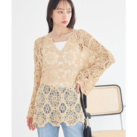 スカラップ×フレアで大人上品フェミニンスタイルに繊細なクロシェ風デザインが印象的で、着るだけで華やかさを演出できるプルオーバーです。フレアスリーブが腕まわりをやさしくカバーしながら、軽やかで女性らしいシルエットを作ります。裾のスカラップがコーディネートにやわらかなアクセントを加え、さりげない可愛らしさを引き立てます。キーネック仕様で首元がすっきり見え、抜け感のある着こなしが楽しめます。デイリーからお出かけまで幅広く使え、コーディネートの幅を広げてくれる便利な一着です。透け感[あり]