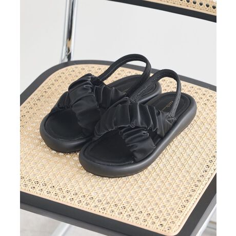立体感のあるギャザーとクロスデザインが、足元に程よいボリュームと華やかさをプラスしてくれるサンダルです。やわらかな素材感で足あたりが良く、リラックスした履き心地を感じていただけます。ゴムストラップ仕様でかかとにフィットし、歩行時も安定感があり安心です。フラットに近いソールで歩きやすく、デイリー使いにもぴったりです。パンツにもスカートにも合わせやすく、カジュアルコーデをぐっとおしゃれに引き上げてくれます。気軽に履けてスタイリングの幅が広がる、毎日活躍する一足です。