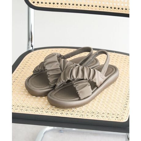 立体感のあるギャザーとクロスデザインが、足元に程よいボリュームと華やかさをプラスしてくれるサンダルです。やわらかな素材感で足あたりが良く、リラックスした履き心地を感じていただけます。ゴムストラップ仕様でかかとにフィットし、歩行時も安定感があり安心です。フラットに近いソールで歩きやすく、デイリー使いにもぴったりです。パンツにもスカートにも合わせやすく、カジュアルコーデをぐっとおしゃれに引き上げてくれます。気軽に履けてスタイリングの幅が広がる、毎日活躍する一足です。