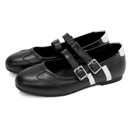 愛らしいラウンドトゥと2本のストラップが足元にアクセントを添え、程よい存在感を演出します。