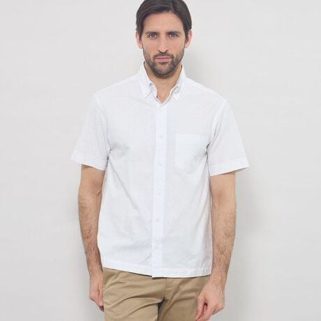 アメリカンテイストの釦ダウンシャツを背中のギャザー使いや袖口の鏑仕様などエレガントな雰囲気に仕上げました。タックイン/タックアウトどちらもきれいに着こなせるよう設計しています。脇下と首の後ろにデオドラントテープを施すことで、消臭効果も付与しています。