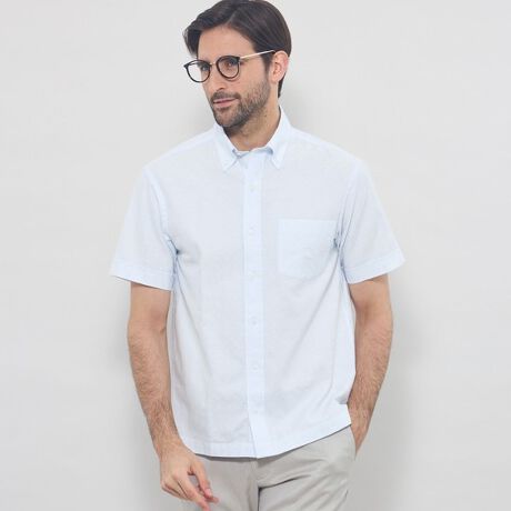 アメリカンテイストの釦ダウンシャツを背中のギャザー使いや袖口の鏑仕様などエレガントな雰囲気に仕上げました。タックイン/タックアウトどちらもきれいに着こなせるよう設計しています。脇下と首の後ろにデオドラントテープを施すことで、消臭効果も付与しています。