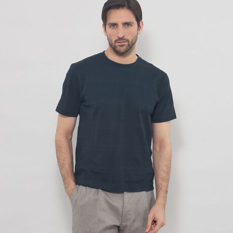 生地の表面にニットのような凹凸感のあるジャージー素材を使用しています。表情豊かな編み柄がボーダー状に入っており、1枚でサマになります。