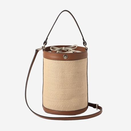 [型番:G5103741__]ナチュラル感のあるラフィア混ブレードとレザーのコンビの巾着付バケットショルダーです。ブレードは帽子職人が丁寧に縫製し繋げています。レザーはイタリアのソフトな型押レザーを使用。内側にはポケットが付いています。ドット釦を付ければバッグの形を舟形に変えて使用もできます。タウンやリゾートで活躍する、熟練した職人によって丁寧に作られたMADE IN JAPANのバッグです。