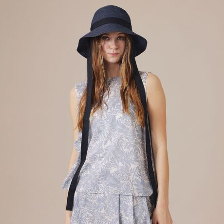 ナチュラルなラフィア混ブレードを縫い合わせグログランテープでトリミングしたハットです。内側から両サイドに垂れるテープは垂らしたまま被っても、顎の下や首の後ろで結ぶこともおすすめです。取り外して使うことも可能です。適度なつばの長さがあるので、普段使いやお出かけ、旅行やリゾートでの紫外線対策に最適です。軽く畳んでバッグの中にも入れられ、持ち運びにも便利です。熟練した職人が1点1点丁寧に縫製、型入れして仕上げたMADE IN JAPANの帽子です。