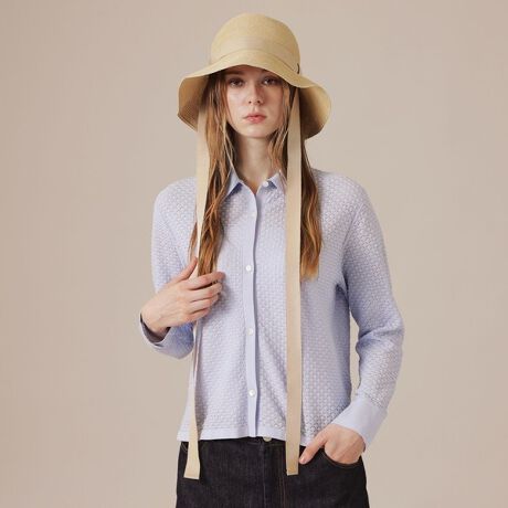 ナチュラルなラフィア混ブレードを縫い合わせグログランテープでトリミングしたハットです。内側から両サイドに垂れるテープは垂らしたまま被っても、顎の下や首の後ろで結ぶこともおすすめです。取り外して使うことも可能です。適度なつばの長さがあるので、普段使いやお出かけ、旅行やリゾートでの紫外線対策に最適です。軽く畳んでバッグの中にも入れられ、持ち運びにも便利です。熟練した職人が1点1点丁寧に縫製、型入れして仕上げたMADE IN JAPANの帽子です。