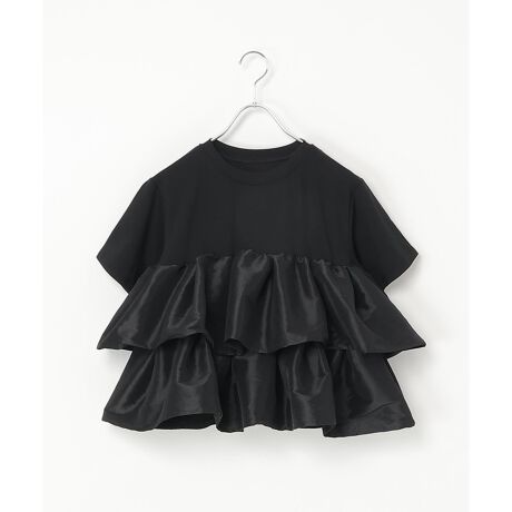透けにくい肉感のある天竺のTシャツに、光沢とハリ感のある生地をフリルとしてドッキング。