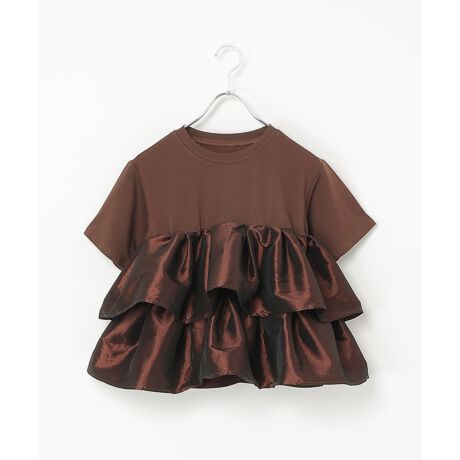 透けにくい肉感のある天竺のTシャツに、光沢とハリ感のある生地をフリルとしてドッキング。