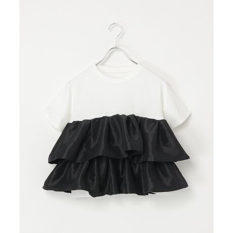 透けにくい肉感のある天竺のTシャツに、光沢とハリ感のある生地をフリルとしてドッキング。