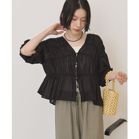 フロントリボンがさりげないアクセントになった、女性らしさ引き立つブラウスです。ふんわりとしたバルーン袖と軽やかな透け感が、動くたびにやわらかな印象を演出してくれます。接触冷感素材を使用しているため、暑い季節でもひんやりとした着心地で快適に過ごせるのが嬉しいポイントです。ゆったりとしたシルエットで体のラインを拾いにくく、リラックス感のある着こなしが叶います。デニムやスカートと合わせるだけで、大人カジュアルなスタイルが完成し、日常からお出かけまで幅広く活躍します。見た目の涼しさと着心地の良さを両立した一枚です。