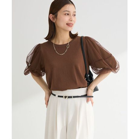 ボリューム感のあるチュールスリーブが目を引くデザインで、シンプルな着こなしに華やぎをプラスできる一枚です。軽やかな透け感が抜け感を演出し、季節感のあるスタイリングを楽しめます。ニット部分はやさしく体に沿うシルエットで、すっきりとした印象をキープしながら着心地の良さも兼ね備えています。袖の立体感が腕まわりを美しく見せ、自然とスタイルアップ効果も期待できます。パンツにもスカートにも合わせやすく、オンオフ問わず活躍する着回し力の高いアイテムです。