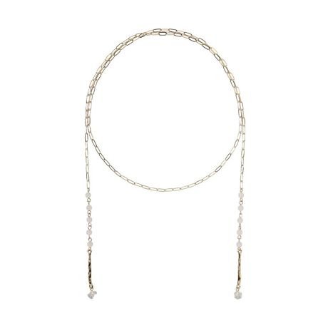 繊細なチェーンにストーンをあしらったラリエットは、動くたびにやわらかな輝きを放ち、首元を上品に彩ってくれます。縦に流れるシルエットがデコルテをすっきりと見せ、スタイルアップ効果も期待できるのが魅力です。ストーンのナチュラルな質感とメタルの上品な光沢が絶妙に調和し、シンプルなコーディネートにも自然なアクセントをプラスします。結び方やバランスを調整することで印象を変えられるため、幅広いスタイリングに対応可能です。軽やかな着け心地で日常使いにも取り入れやすく、ひとつでコーディネートの完成度を高めてくれる便利なアクセサリーです。