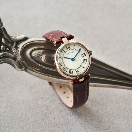 端正なラウンドケースに、クラシカルなローマ数字の文字盤、そしてやわらかな表情を持つレザーストラップを組み合わせ、手元に静かな品格をもたらします。