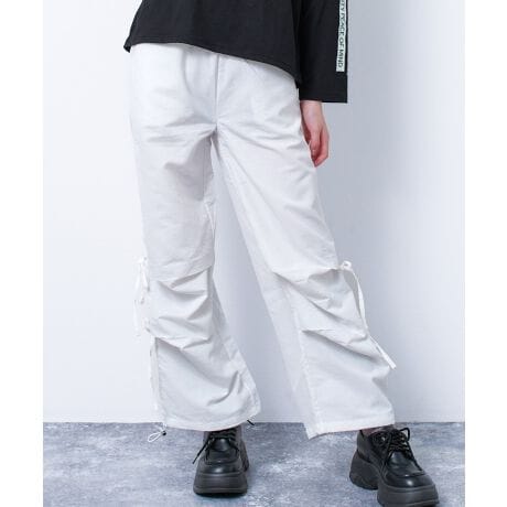 【item info】トレンド感のあるディテールを詰め込んだ、サイドリボンデザインのナイロンパンツ。膝部分にタックを入れることで立体感をプラスし、動きのあるシルエットに仕上げました。サイドにあしらったリボンがさりげないアクセントになり、スポーティーな中にも可愛らしさを演出。裾の内側にはドローストリングを施しており、絞り具合を調整することでシルエットの変化を楽しめます。程良いワイドシルエットで体のラインを拾いにくく、デイリー使いにもぴったり◎Tシャツでカジュアルに、コンパクトなトップスと合わせたバランスコーデもおすすめです。