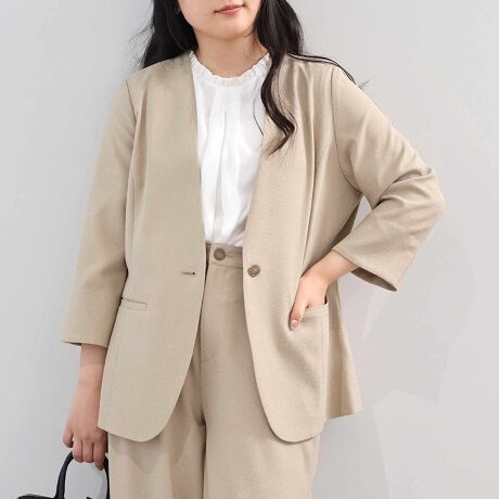 お顔周りをシャープに見せるVラインと、スッキリとしたシングルボタンのデザインで、着痩せ効果も抜群です。