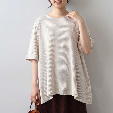 袖口の折り返し風デザインがさりげないアクセントになり、二の腕をしっかりカバーしてくれる5分袖で、上半身を華奢な印象に見せてくれます。