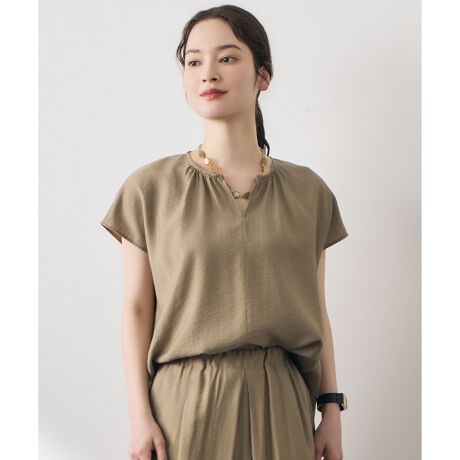 昨年ご好評いただいたエアリーツイルに新型のブラウスが登場!爽やかな着心地とすっきり見えを叶えるプルオーバーブラウス■デザイン衿ぐりにギャザーを寄せた、程よい抜け感のあるプルオーバーブラウスです。小さめのキーネックが顔まわりをすっきりと見せ、女性らしい印象に仕上げてくれます。後ろ裾はシャツテールデザインにすることで、腰まわりをさりげなくカバー。フレンチスリーブは短すぎない裄丈で、二の腕を自然にカバーしつつ涼やかなバランスです。しなやかで薄手の素材を使用しているため、これからの暑い季節に快適に着用いただけます。一枚着としてはもちろん、羽織りのインナーとしても合わせやすく、スタイリングの幅広さも魅力です。■素材柔らかく綺麗なレーヨンと程よい光沢感のあるナイロンを、とろみとドレープ感に若干のハリ感を出してバランスよく仕上げたツイル素材です。非常に軽く、揺れるような動きのある綺麗な素材ですが、やや表情のあるラフな表面感に仕上げた大人カジュアルな素材です。接触冷感、UVケアの機能付きです。■同素材ワイドパンツ(PRWRGM0507)キュロットパンツ(PRWRGM0508)