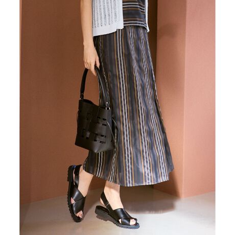 印象的なストライプ柄が目を惹くフレアスカート■デザイン巻きスカートのように見えるタックが入った、表情豊かなAラインフレアスカートです。 ウエスト周りはすっきりと見せつつ、裾に向かって広がり過ぎない計算されたシルエットで、大人っぽい雰囲気に仕上げました。後ろウエストにはゴムが入っているので快適な着心地になっているのも魅力です。印象的なストライプ柄で、シンプルなトップスを合わせるだけで大人っぽいコーディネートが完成します。同素材のブラウス(BLW7LM0515)と合わせた、ワンピース風のセットアップスタイルもおすすめです。■素材様々な番手と組織を組み合わせた、オリジナルのマルチストライプ柄のジャカード素材を使用しています。ラインごとに組織を変えることで、繊細な立体感と透け感のある部分とのコントラストが生まれ、薄手ながらも表情豊かな1枚に仕上がりました。きれいめなスタイルにはもちろん、カジュアルな着こなしにも馴染む素材感です。■同素材アイテムブラウス(BLW7LM0515)