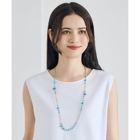 ■デザイン天然石(ハウライト)をあしらった、涼しげなロングネックレスです。 大小のストーンとゴールドのメタルパーツをランダムに配置し、動くたびに揺れる表情豊かなデザインに仕上げました。 留め具にはスライドボールを採用しているため、長さの微調整が自在で、着脱もスムーズに行っていただけます。シンプルなトップスやワンピースに合わせるだけで、大人の装いを華やかに引き立ててくれるアイテムです。