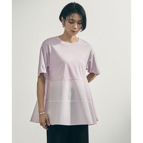■デザイン異素材を組み合わせた着映えTシャツ。上身頃にはジャージ素材を使用しており、動きやすさと上品さの両立を追求しました。身体にフィットしすぎないゆとりと、すっきりした衿の仕立てにこだわっています。ウエスト下は、適度にハリのあるブロード素材を使用。ティアードデザインが、裾にかけてきれいなシルエットを演出します。パンツと合わせたスタイリングはもちろん、すっきりとしたIラインスカートとも好相性です。