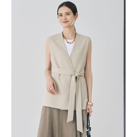 さらっとした着心地と上品なシルエットで大人の着こなしを格上げするノーカラージレ■デザインすっきりとしたストレートシルエットで仕立てた、ダブル前のノーカラージレです。 襟ぐりに切り替えを入れることで首元に自然に沿い、お顔周りをシャープで上品な印象に見せてくれます。 共布のベルトでウエストマークすればメリハリのあるシルエットに、ベルトを外せばリラックス感のある着こなしにと、気分に合わせてアレンジをお楽しみいただけます。 きれいめからカジュアルまで合わせやすく、いつものコーディネートにプラスするだけで洗練されたスタイルが完成します。■素材バスケット織りならではのざっくりとしたリラックス感があり、リネンのようなナチュラルな表情が魅力です。 さらっとしたドライタッチで通気性が良く、ベタつかず蒸れにくい快適な着心地を実現しました。 しわが気になりにくく、ご家庭でのお洗濯も可能なイージーケア素材のため、デイリーに気兼ねなくお使いいただけます。