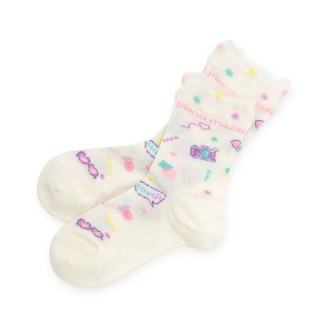 シーズンテーマの「Fancy Pop柄」をデザインしたソックスです。はき口にあしらった透けるフリルがポイント。使い勝手の良いクルー丈なので、ワンピースやミニスカートに合わせやすいアイテムです。長時間の着用も快適な抗菌防臭機能もついています。【抗菌防臭】