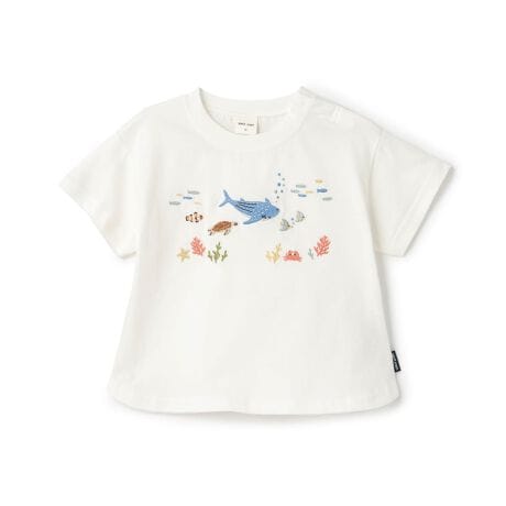 水中をイメージした個性的なデザインのTシャツです。さまざまな海の生き物たちが繊細に刺しゅうされています。ベースにやわらかい綿100%素材を使用し、快適な着心地を実現。ひんやりとする接触冷感仕様のため、暑い日のお出かけ着にぴったりです。内側にお名前を記入できるタグつき。※80、90サイズのみ肩開き