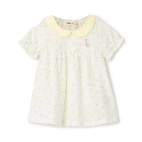 淡いカラーのミニローズをちりばめた花柄プリントのTシャツです。ベビーらしいやさしい雰囲気に仕上げました。胸にはソフィーのワンポイント刺しゅう入り。やわらかく肌触りの良いコットン100%素材を使用しています。バックネックはゴム仕様なのでお着替えも簡単。衿つきでキチンと感があるため、普段のコーデはもちろんお出かけスタイルにもおすすめです。内側にお名前を記入できるタグつき。