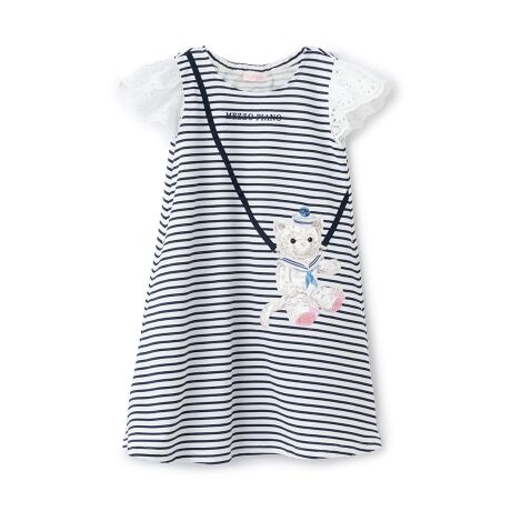 オリジナルのリップルボーダー生地で仕立てたワンピースです。ポシェットを肩からかけているようなトロンプルイユデザインが可愛いポイント。ピンクはうさぎ、紺はネコのアップリケです。レースのお袖でガーリーな印象と軽やかさをプラスしました。ひんやり心地よい接触冷感素材なので、暑い日もさらっと快適に着用可能。1枚でコーデが完成するため、デイリーにもお出かけにも活躍します。両サイドにポケットつき。内側にお名前を記入できるタグがついています。【おすすめの着用時期は春夏シーズン】