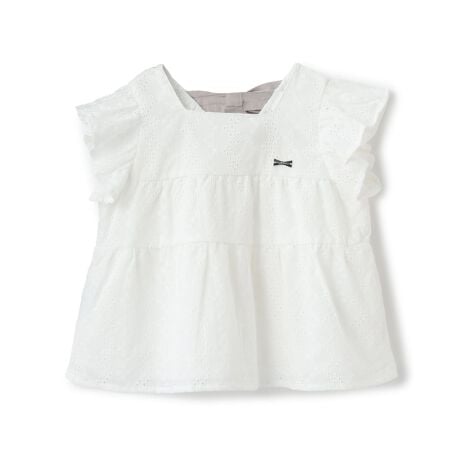 つけ外し可能なバイカラーのリボンがセットになっているチュニックです。お花が刺しゅうされたやさしい雰囲気のコットンレースを使用。ティアードシルエットや袖のフリルで女の子らしい一着に仕上げました。後ろ衿ぐりはゴム仕様なので、お着替えも簡単です。
