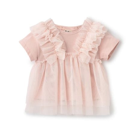 チュールビスチェを着ているようなドッキングTシャツです。シンプルな無地にフリルをたっぷりあしらい、華やかな雰囲気を演出。本体はやわらかい綿100%素材なので、快適な着心地です。バックネックにゴムが入っており、スムーズなお着替えが叶います。