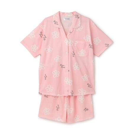 ニット生地を使用したやわらかい着心地のセットアップです。トップスは首元がすっきりと見える開衿シャツになっています。ボトムスのウエストはフィット感の良い総ゴム仕様。手書き風のお花とブランドロゴがちりばめられた総柄デザインです。