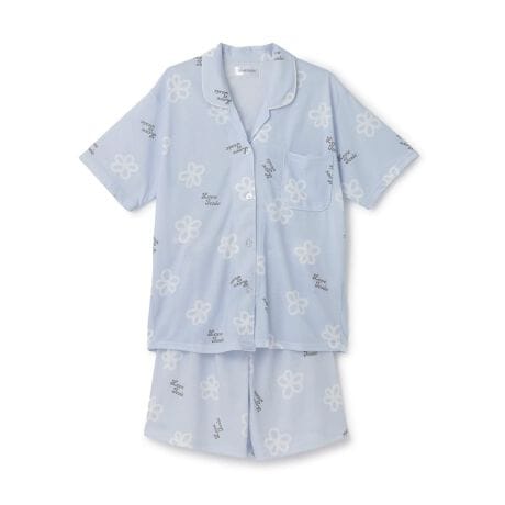 ニット生地を使用したやわらかい着心地のセットアップです。トップスは首元がすっきりと見える開衿シャツになっています。ボトムスのウエストはフィット感の良い総ゴム仕様。手書き風のお花とブランドロゴがちりばめられた総柄デザインです。