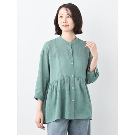 [型番:6251228]コットンの楊柳素材を使ったチュニック丈のブラウスです。ウエスト切替にギャザーを施し、ふんわりと優しいシルエットを出しました。気になるおなか周りをしっかりとカバーしてくれます。軽くて肌離れの良い生地なので暑い季節の羽織アイテムとして活躍します。涼しげなマットシルバーの釦がアクセントになっています。