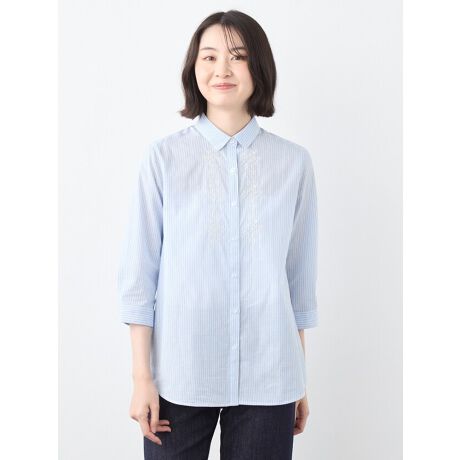 [型番:6251237]繊細なストライプ先染め生地を使用し、胸元に可憐な刺繍を施したブラウスです。可愛らしいナチュラルな刺繍モチーフがさりげない華やぎを出してくれる魅力ある1枚です。陽射しの強い季節に日除けとして使える衿付のシャツデザイン。羽織りとしても使え、コーディネートの幅が広がります。