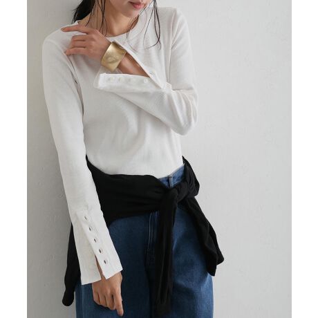 袖口のボタンディテールがアクセントになり、シンプルながらも表情のある一枚。