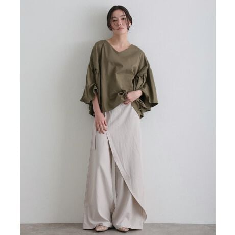 ゆったりとしたドロップショルダーと広がる袖が、自然な抜け感を演出。
