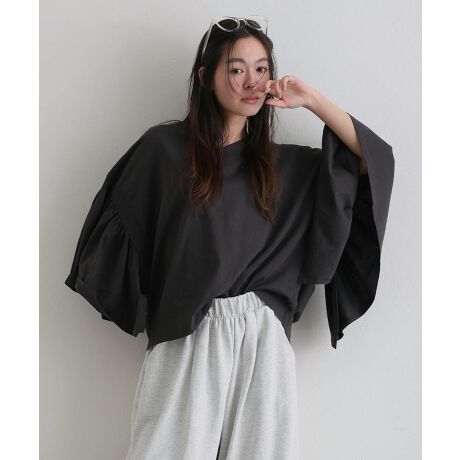 ゆったりとしたドロップショルダーと広がる袖が、自然な抜け感を演出。