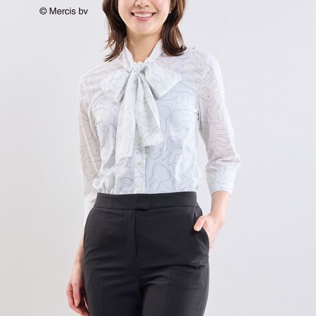 ミッフィーのフェイス柄をあしらった七分袖ボウタイブラウス。モノトーン配色で落ち着いた印象に仕上げ、さりげなく取り入れやすいデザインです。顔まわりにポイントを添えるボウタイがアクセントになり、きれいめなスタイリングにもなじみます。シンプルなボトムと合わせるだけでバランスよくまとまり、大人のコーディネートに取り入れやすい仕上がりです。