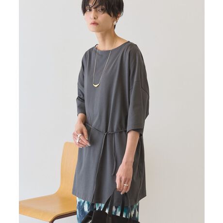 後身頃に大きなタックを施したオーバーサイズシルエットのトップス。ヒップがすっぽり隠れるチュニック丈で気になる体型をカバーします。広すぎないボートネックは程よい抜け感を演出。ソフトでさらりとした素材感で着心地も快適です。ウエストに通した共紐で絞ればメリハリのあるシルエットに変わる2WAYデザイン。細身のボトムスと相性が良く、デイリーからきれいめまで幅広く活躍します。