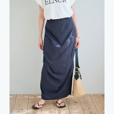 ウエストは総ゴムで楽な履き心地ながら、落ち感のある素材でスマートに見せてくれる一枚です。